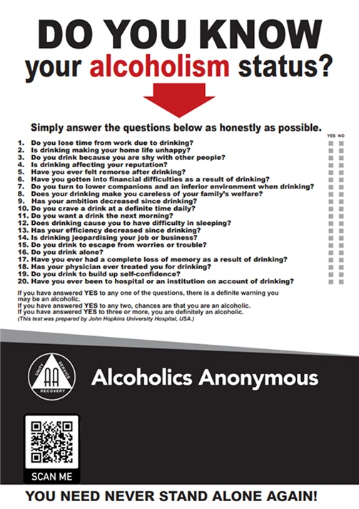 To help you decide, the Johns Hopkins University Hospital developed a simple 20-question self-test. It’s been widely used as a tool for identifying signs of alcoholism.